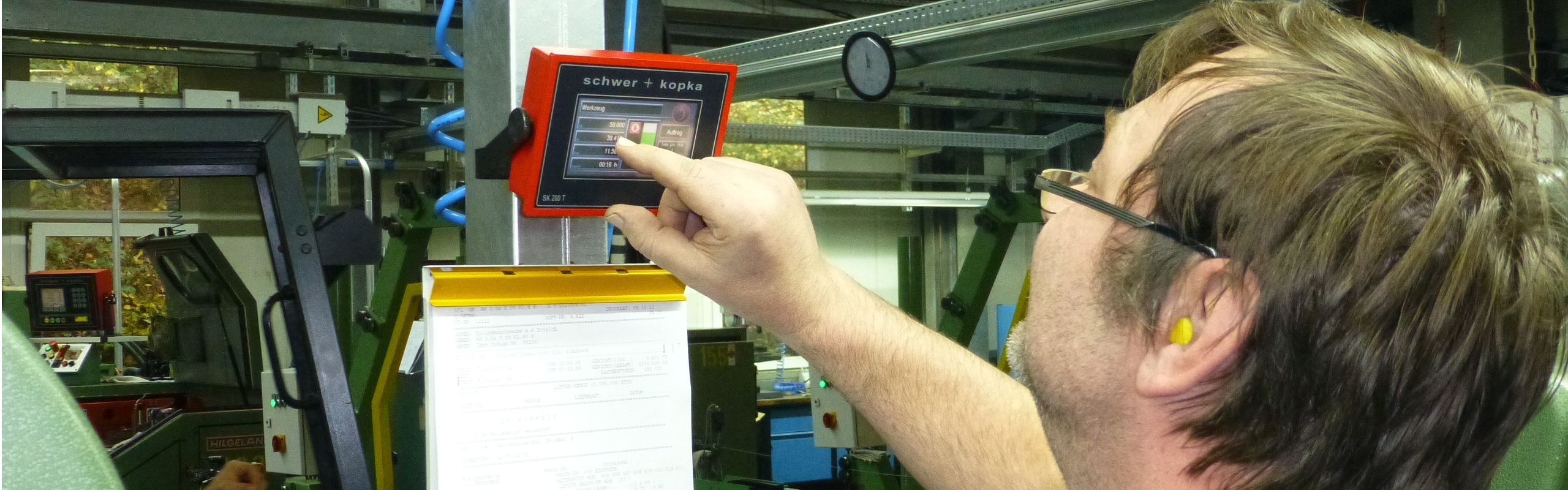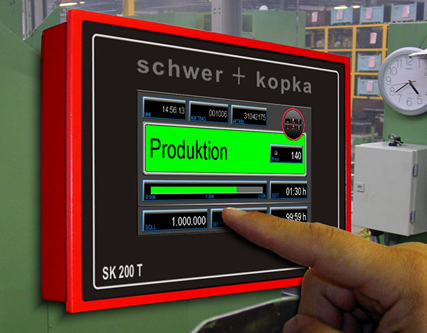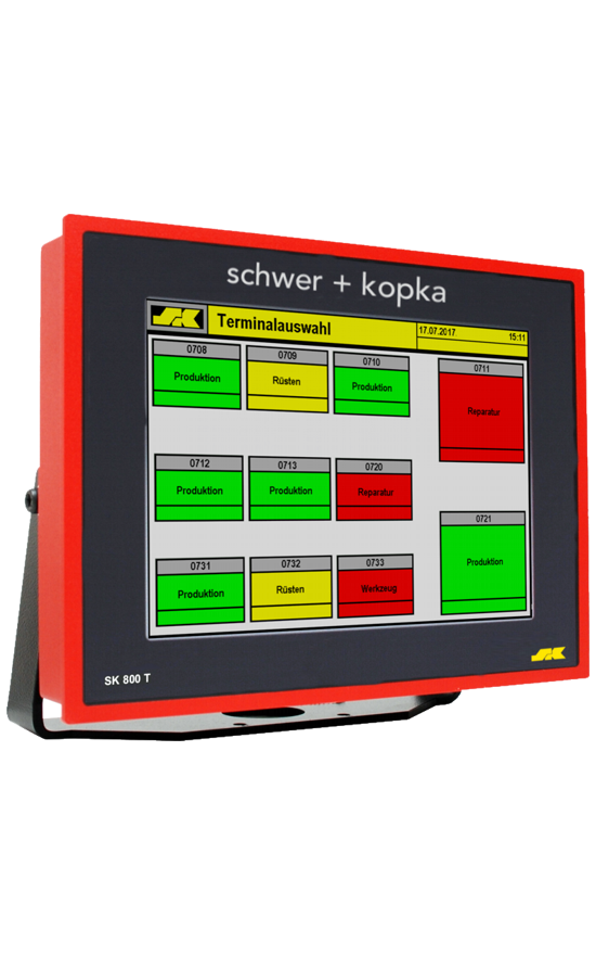 The machine terminal is the central communication device for the entire data exchange between the machine and MES. It is also a comprehensive information control center for the machine operator. The terminal collects all performance data of the machine such as runtimes, downtimes, downtime reasons, cycle rates, manufactured quantities and much more and transfers them to MES.