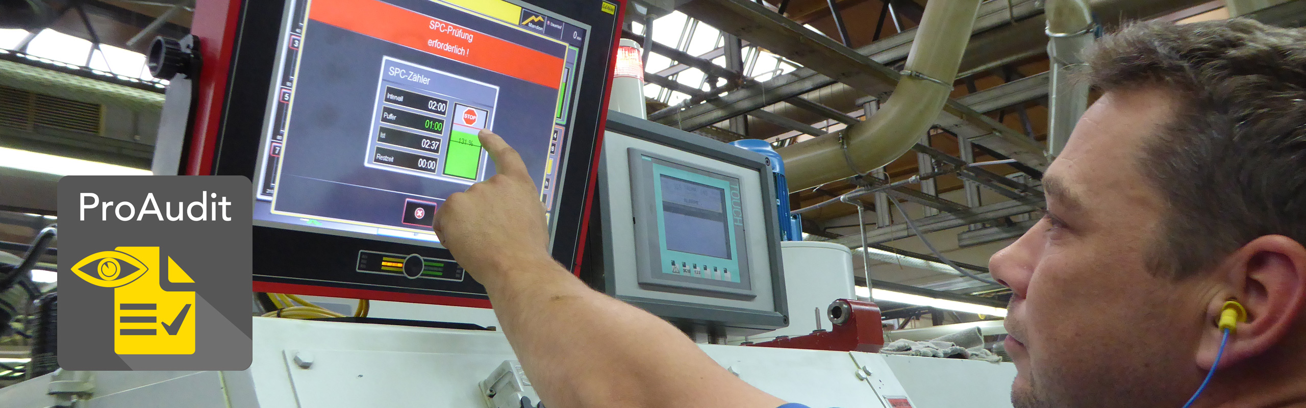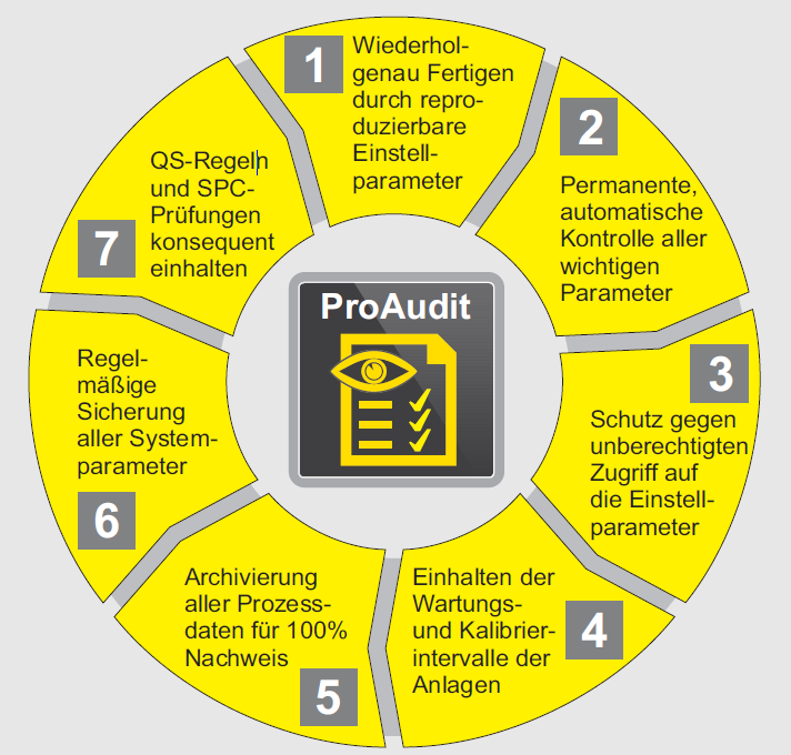 Unser ProAudit-Konzept ist ein effektives Vorgehen mit 7 Maßnahmen zur prozeßsicheren Fertigungskette und den umfassenden Nachweis dazu. Zentrales Element von ProAudit sind die Überwachungsterminals an jeder Maschine in Vernetzung mit der MES-Software SK-go! und Schnittstellen zu Ihren ERP- und CAQ-Systemen.