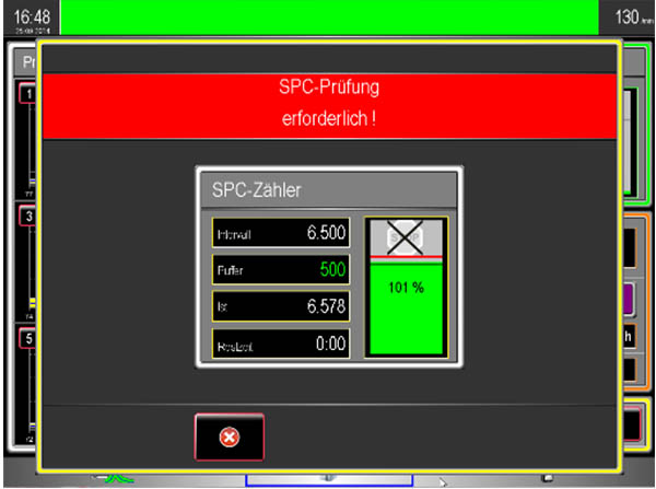 Falls gewünscht, stoppen wir automatisch Ihre Maschinen, wenn fällige SPC-Prüfungen nicht erfolgt sind oder die Messwerte ausserhalb der Toleranzen liegen. Natürlich wird der Werker von uns vorab über die Fälligkeit der nächsten Prüfung informiert.