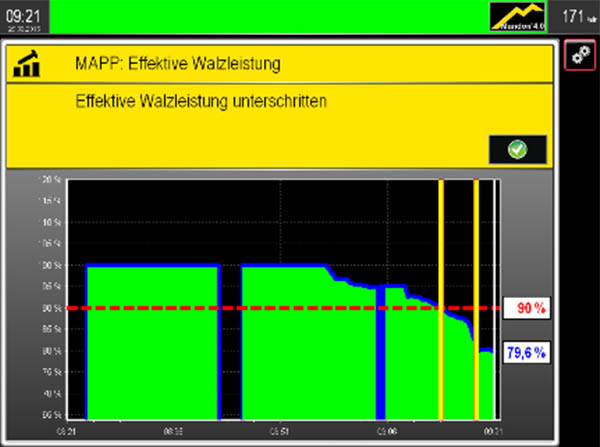 Das Mandon 4.0 Warnsystem in Ihrem Prozessüberwachungssystem sorgt dafür, dass die qualitätsrelevanten Vorgaben für z. B. die Hüllkurveneinstellungen auch eingehalten werden. Mandon warnt den Maschinenbediener in kritischen Situationen automatisch und gibt, wo möglich, Empfehlungen für Korrekturen bzw. kann auf Wunsch die Korrekturen direkt selbsttätig vornehmen. Typische Fälle sind z. B