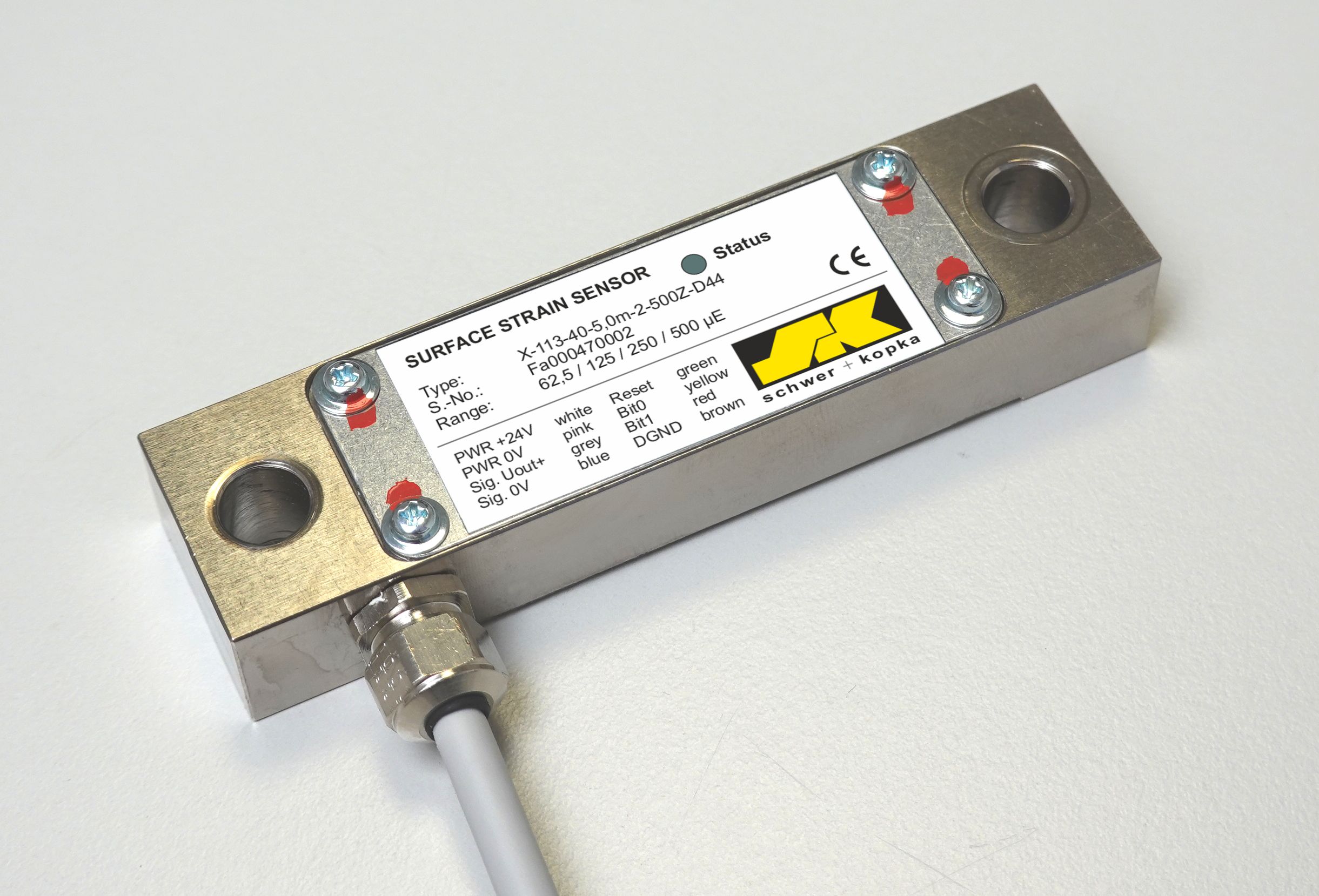 Bolt-on strain sensor based on strain gauge technology with integrated amplifier, high measuring sensitivity and good long-term stability. The X-Flex sensor is used, for example, for press force measurement by bolting with 2 M8 screws on the machine body or press frame. With the machine running, the sensor detects the elongation or strain of the machine body under load, which is directly proportional to the forces actually occurring.